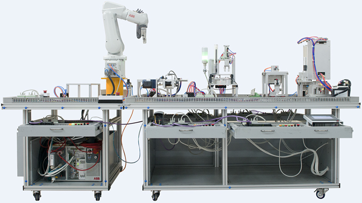工業(yè)機(jī)器人循環(huán)生產(chǎn)線實(shí)訓(xùn)裝備采用1+1組合式結(jié)構(gòu)分別由安裝在鋁合金導(dǎo)軌式的實(shí)訓(xùn)臺(tái)上的送料單元、加工單元、裝配單元、雙層輸送單元、分揀單元5個(gè)單元,加上由鋁合金導(dǎo)軌式的實(shí)訓(xùn)臺(tái)上工業(yè)機(jī)器人碼垛單元兩大部分組合成多種組合方式的實(shí)訓(xùn)裝備。電氣布局采用抽屜式,所有其電氣控制器都安裝在網(wǎng)孔板式的抽屜上,這種機(jī)電分離的格式更加符合了工業(yè)實(shí)際情況。外觀如上圖所示。