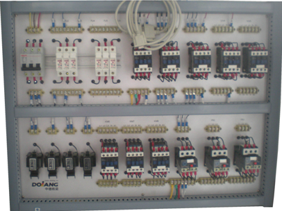 裝置實(shí)驗(yàn)柜正面為車床和銑床的機(jī)床電氣線路元器件布線區(qū)面板。背面是鉆床和磨床的機(jī)床電氣線路元器件布線區(qū)面板。面板上裝有低壓斷路器、直插式保險(xiǎn)絲、交流接觸器、熱繼電器、控制變壓器等元器件,這些元器件直接安裝在面板表面,可以很直觀的看它們的動作情況,且都有相應(yīng)的測試點(diǎn),方便接線及故障考核檢測線路操作。