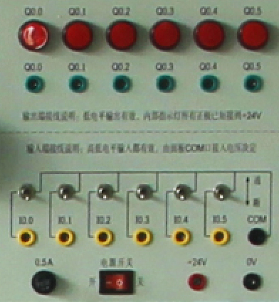 提供6路輸入、6路輸出等接口,輸入、輸出端電壓可自由切換0V和24V,輸出端由指示燈的亮滅來指示PLC輸出口的狀態(tài),面板印有清晰的說明和端口絲印。通過基本指令練習,讓學(xué)生掌握PLC輸入、輸出的外圍接線和工作原理。