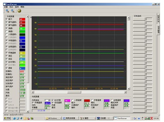中央空調(diào)機(jī)由于工程復(fù)雜,設(shè)備分散,有的已經(jīng)裝修在開(kāi)花板上測(cè)試程序,一但出現(xiàn)了故障,工程量相當(dāng)大,為了能夠快速準(zhǔn)確地測(cè)出故障是由主機(jī)機(jī)組還是室內(nèi)機(jī)的故障的,每個(gè)生產(chǎn)廠家根據(jù)生產(chǎn)的和維修的需要而開(kāi)發(fā)了中央空調(diào)測(cè)試程序?蓽y(cè)試壓縮機(jī)的運(yùn)轉(zhuǎn)頻率,傳感器的各種數(shù)據(jù),電子膨脹閥的工作步數(shù)等幾十種中央空調(diào)的工作數(shù)據(jù)和狀態(tài),軟件可實(shí)現(xiàn)對(duì)內(nèi)機(jī)的控制,,可以對(duì)1-64臺(tái)內(nèi)機(jī)的狀態(tài)進(jìn)行設(shè)定。是高校提供了好的研究的學(xué)習(xí)設(shè)備。