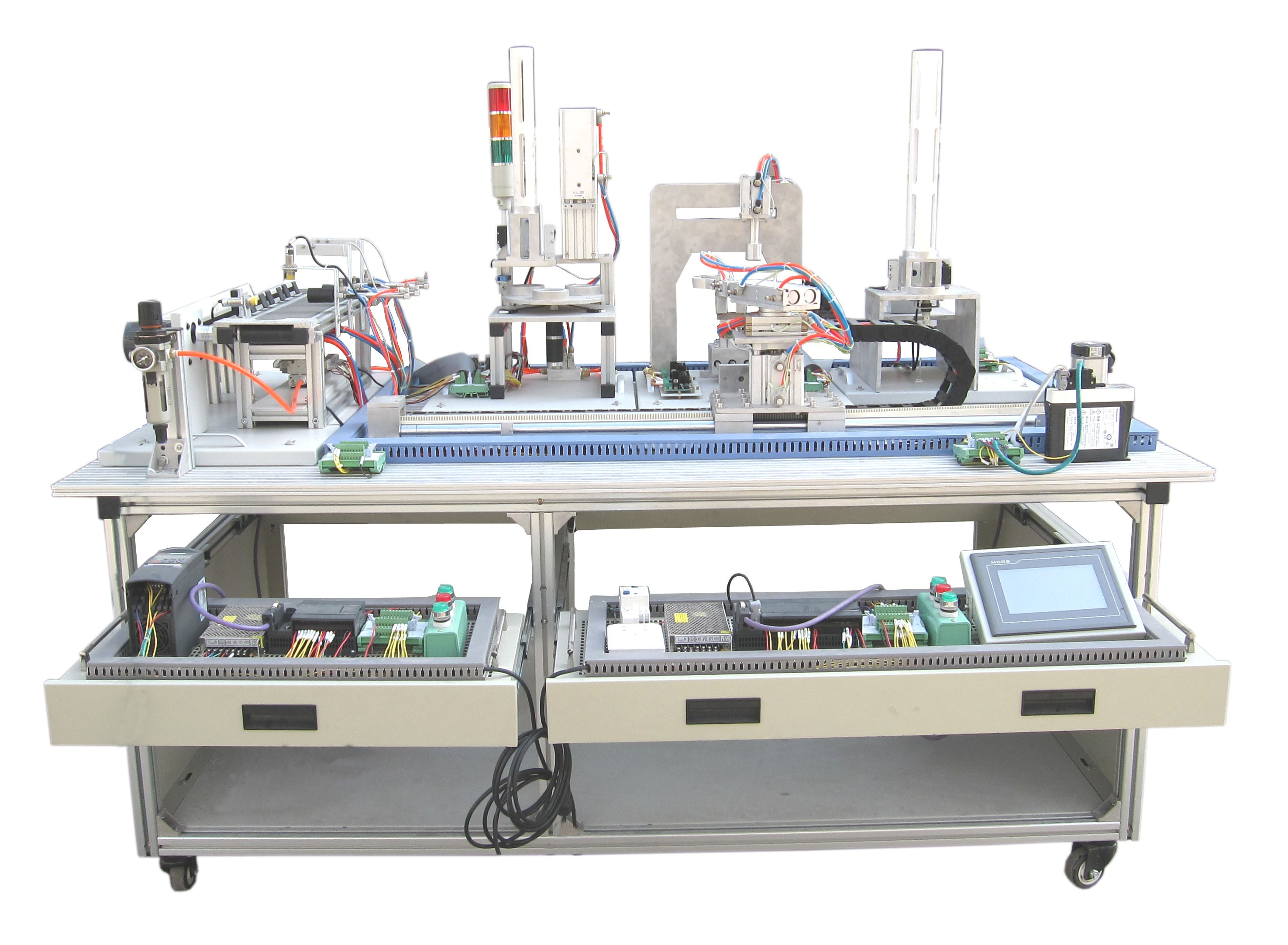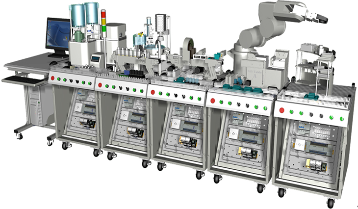 機(jī)電一體化技術(shù)實(shí)訓(xùn)設(shè)備是指機(jī)械技術(shù)、電工電子技術(shù)、微電子技術(shù)、信息技術(shù)、傳感器技術(shù)、接口技術(shù)、信號變換技術(shù)等多種技術(shù)進(jìn)行有機(jī)地結(jié)合,并綜合應(yīng)用到實(shí)際中去的技能實(shí)訓(xùn)綜合技術(shù),現(xiàn)代化的自動生產(chǎn)設(shè)備幾乎可以說都是機(jī)電一體化的設(shè)備。自動化生產(chǎn)線實(shí)訓(xùn)考核系統(tǒng),可以培養(yǎng)和提高學(xué)生專業(yè)綜合能力,是一種重要的實(shí)訓(xùn)設(shè)備。自動化生產(chǎn)線實(shí)訓(xùn)系統(tǒng)、基于PLC技術(shù)的自動化生產(chǎn)線實(shí)訓(xùn)考核系統(tǒng),可以培養(yǎng)和提高學(xué)生專業(yè)綜合能力,是一種重要的實(shí)訓(xùn)設(shè)備。自動化生產(chǎn)線實(shí)訓(xùn)系統(tǒng)整體包括自動供料、檢測傳輸、檢測加工、自動裝配、自動分揀等工序,很好的將機(jī)械技術(shù)、微電子技術(shù)、電工電子技術(shù)、傳感測試技術(shù)、接口技術(shù)、信息變換技術(shù)、網(wǎng).絡(luò)通信技術(shù)等多種技術(shù)有機(jī)地結(jié)合。該系統(tǒng)中自動分揀站的設(shè)計(jì)過程,包括系統(tǒng)硬件設(shè)計(jì)、PLC控制設(shè)計(jì)和程序設(shè)計(jì)方法,F(xiàn)代化的自動生產(chǎn)設(shè)備的最大特點(diǎn)是它的綜合性和系統(tǒng)性,在這里,機(jī)械技術(shù)、微電子技術(shù)、電工電子技術(shù)、傳感測試技術(shù)、接口技術(shù)、信息變換技術(shù)、網(wǎng)絡(luò)通信技術(shù)等多種技術(shù)有機(jī)地結(jié)合,并綜合應(yīng)用到生產(chǎn)設(shè)備中:而系統(tǒng)性指的是,生產(chǎn)線的傳感檢測、傳輸與處理、控制、執(zhí)行與驅(qū)動等機(jī)構(gòu)在微處理單元的控制下協(xié)調(diào)有序地工作,有機(jī)地融合在一起?删幊绦蚩刂破(PLC)以其高抗干擾能力、高可靠性、高性能價格比且編程簡單而廣泛地應(yīng)用在現(xiàn)代化的自動生產(chǎn)設(shè)備中,擔(dān)負(fù)著生產(chǎn)線的大腦一微 處理單元的角色。因此,培養(yǎng)掌握機(jī)電一體化技術(shù),掌握PLC技術(shù)及PLC網(wǎng)絡(luò)技術(shù)的技術(shù)人材是當(dāng)務(wù)之急。而一套基于PLC技術(shù)的自動化生產(chǎn)線實(shí)訓(xùn)考核設(shè)備可以模擬一個與實(shí)際生產(chǎn)情況+分接近的控制過程,使學(xué)習(xí)者得到一個非常接近于實(shí)際的教學(xué)設(shè)備環(huán)境,從而縮短了理論教學(xué)與實(shí)際應(yīng)用之間的距離。自動分揀站需完成對上一單元送來的已加工、裝配的工件進(jìn)行分揀。使不同顏色的工件從不同的料槽分流的功能。當(dāng)輸送站送來工件放到傳送帶上并為入料口光電傳感器檢測到時,即啟動變頻器,工件開始送入分揀區(qū)進(jìn)行分揀。上海碩博弘揚(yáng)大國工匠精神, 發(fā)展職業(yè)教育,應(yīng)用教學(xué)設(shè)備,為企業(yè)培養(yǎng)高技能人才,而專業(yè)生產(chǎn):光機(jī)電一體化(自動生產(chǎn)線)實(shí)訓(xùn)裝置、灌裝自動化生產(chǎn)線實(shí)訓(xùn)裝置、工業(yè)自動生產(chǎn)線實(shí)訓(xùn)裝置 、工業(yè)控制模擬實(shí)訓(xùn)裝置 、機(jī)電一體化組合實(shí)訓(xùn)平臺 、機(jī)電一體化綜合實(shí)訓(xùn)考核裝置、自動化生產(chǎn)安裝與調(diào)試實(shí)訓(xùn)裝置 、光機(jī)電一體化高速分揀實(shí)訓(xùn)系統(tǒng) 、典型機(jī)電設(shè)備安裝與控制實(shí)訓(xùn)裝置、模塊式柔性自動環(huán)形生產(chǎn)線實(shí)驗(yàn)系統(tǒng)(帶機(jī)器人工程型)、立體停車庫實(shí)物教學(xué)實(shí)驗(yàn)裝置、機(jī)電一體化柔性生產(chǎn)線加工實(shí)訓(xùn)系統(tǒng)(5站)、網(wǎng)絡(luò)型模塊式柔性自動化生產(chǎn)線實(shí)驗(yàn)系統(tǒng)、模塊式柔性自動環(huán)形生產(chǎn)線實(shí)驗(yàn)系統(tǒng)(工程型)、柔性生產(chǎn)制造實(shí)驗(yàn)系統(tǒng)(工程型)、現(xiàn)代物流倉儲自動化實(shí)驗(yàn)系統(tǒng)、運(yùn)動實(shí)訓(xùn)裝置、循環(huán)搬運(yùn)自動控制實(shí)訓(xùn)裝置、平面雙軸運(yùn)行控制實(shí)訓(xùn)裝置、工業(yè)機(jī)械手實(shí)訓(xùn)裝置、物料分揀實(shí)訓(xùn)裝置、機(jī)械手實(shí)訓(xùn)裝置 、立體倉庫實(shí)訓(xùn)裝置、十字路口交通燈實(shí)訓(xùn)系統(tǒng)、機(jī)電液氣一體化綜合實(shí)訓(xùn)裝置、光機(jī)電一體化高速分揀實(shí)訓(xùn)系統(tǒng)、步進(jìn)伺服控制綜合實(shí)訓(xùn)平臺、光機(jī)電氣一體化控制實(shí)訓(xùn)系統(tǒng)、 光機(jī)電一體化綜合實(shí)訓(xùn)考核裝置、光機(jī)電一體化實(shí)訓(xùn)考核裝置、光機(jī)電一體化實(shí)訓(xùn)考核裝置、光機(jī)電氣一體化控制實(shí)訓(xùn)系統(tǒng)、自動生產(chǎn)線拆裝與調(diào)試實(shí)訓(xùn)裝置、柔性自動化生產(chǎn)線實(shí)訓(xùn)系統(tǒng)。