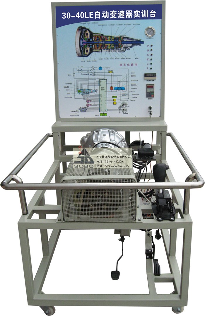 本變速器實訓臺是本公司采用豐田后驅(qū)A340E自動變速器為適應(yīng)汽車教學需求而研制的,該實訓臺由電控變速器(八成新)、操作顯示面板及發(fā)動機彩色電氣原理圖電腦控制柜、可移動式臺架(萬向腳輪)、驅(qū)動系統(tǒng)(腳踏式油門踏板)變頻電機驅(qū)動、啟動系統(tǒng)(電門鎖方式啟動)、車速傳感器、電磁閥執(zhí)行器、原車電腦、具有發(fā)動機運轉(zhuǎn)及顯示(轉(zhuǎn)速.車速.檔位)、液壓油壓力顯示表(顯示換檔過程油壓)、自動變速器電磁閥工作指示LED燈、故障設(shè)置區(qū)可設(shè)置12路故障(老師設(shè)置任一路線路故障)、故障排除區(qū)(學生通過各種儀器、儀表、)在面板上用專用排故線連接排除故障、傳感器信號模擬等多項功能、具結(jié)構(gòu)緊湊、操作方便、安全可靠、教學直觀、是汽車自動變速器實物教學不可缺少的實驗室設(shè)備之一。