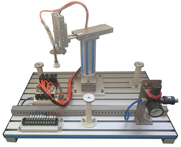 模型由回轉(zhuǎn)氣缸、雙軸氣缸、單軸氣缸、吸盤、真空發(fā)生器、電磁閥、節(jié)流閥、手滑閥、減壓閥、磁性開關(guān)、機械部件、工業(yè)鋁合金型材底板等組成,設(shè)有兩個抓取工位,可進行工件取放控制練習?砷_展對氣動機械手的操作及編程控制訓(xùn)練。配有空氣壓縮機:靜音無油,工作電源AC220V±10% 50Hz,輸入功率0.68kW;公稱容積24L,理論流量:116L/min,額定輸出氣壓0.7MPa。