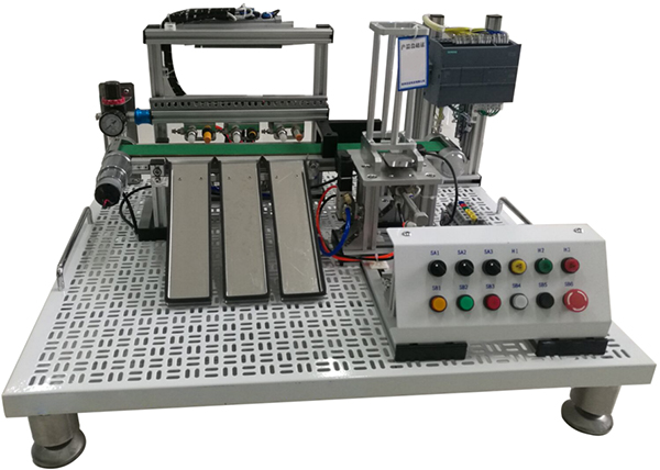 (4)按鈕模塊采用型材底座,安裝面板與桌面成45°夾角,包含急停按鈕1只,旋鈕開關(guān)3只,自鎖帶燈按鈕黃、綠、紅各1只,所有按鈕和旋鈕觸點均引至端子接線排上;自動上料模塊主體安裝在工業(yè)型材上,結(jié)構(gòu)由鋁型材構(gòu)成,方型工件庫1件,物料推出機構(gòu)1件,光電傳感器,單缸氣缸1只,主要完成將工件庫中的工件依次推出;傳輸線模塊主要包含直流電機1臺,滾動軸承4只,滾輪2只,傳輸帶1條,主要完成將工件輸送到分揀區(qū);物料檢測及分揀模塊主要包含氣缸3個,電感傳感器1只,電容傳感器1只;漫反射式光電傳感器1只,物料分揀槽3個,完成物料的分揀工作。調(diào)壓閥主要安裝在型材底座支架上,含有手滑閥可控制氣路的通斷和壓力。輔助器件包含接線端子、物料、實訓(xùn)導(dǎo)線、氣管等,模型控制所需的I/O點數(shù)與所配主機I/O點數(shù)相配套。氣缸使用范圍0.1-1MPa,工作溫度-15-60℃,活塞帶磁環(huán)可完成檢測;光電傳感器檢測范圍不小于1CM,輸出電流80-200MA,防護等級IP65,輸出方式NPN常開;傳感器檢測范圍不小于1CM,輸出電流80-200MA,防護等級IP65,輸出方式NPN常開。