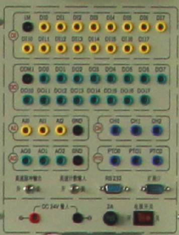 提供6路輸入、6路輸出等接口,輸入、輸出端電壓可自由切換0V和24V,輸出端由指示燈的亮滅來指示PLC輸出口的狀態(tài),面板印有清晰的說明和端口絲印。通過基本指令練習,讓學(xué)生掌握PLC輸入、輸出的外圍接線和工作原理。 |