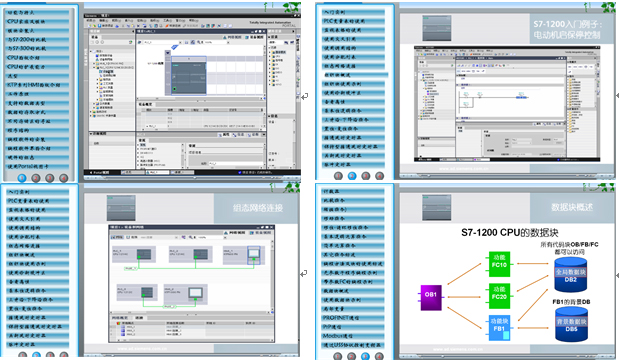 配有S7-1200 PLC學(xué)習軟件,方便老師教學(xué),提供有功能與特點、模塊安裝、選型、工作原理、支持的數(shù)據(jù)類型、數(shù)據(jù)的存取方式、程序結(jié)構(gòu)、編程軟件的安裝、編程軟件界面介紹、硬件的組態(tài)、入門實例、PLC變量表的使用、使用交叉引用、組織塊使用示例、基本位邏輯指令、上升沿-下降沿指令、置位-復(fù)位指令、接通延時定時器、比較指令、移位-循環(huán)移位指令、基本邏輯運算指令、數(shù)據(jù)塊概述等50多個學(xué)習項目。PLC學(xué)習軟件參考界面如下: