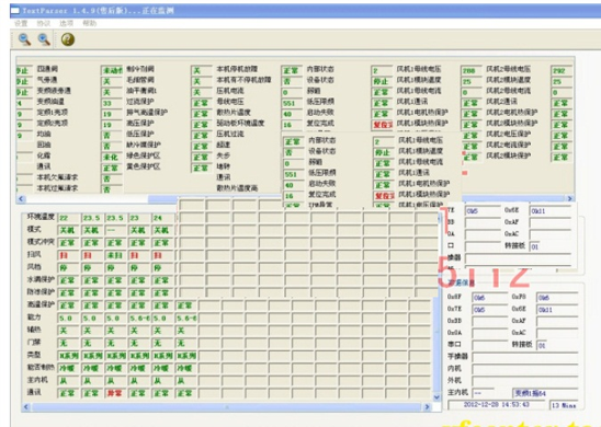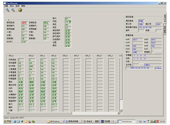 中央空調(diào)機(jī)由于工程復(fù)雜,設(shè)備分散,有的已經(jīng)裝修在開(kāi)花板上測(cè)試程序,一但出現(xiàn)了故障,工程量相當(dāng)大,為了能夠快速準(zhǔn)確地測(cè)出故障是由主機(jī)機(jī)組還是室內(nèi)機(jī)的故障的,每個(gè)生產(chǎn)廠家根據(jù)生產(chǎn)的和維修的需要而開(kāi)發(fā)了中央空調(diào)測(cè)試程序?蓽y(cè)試壓縮機(jī)的運(yùn)轉(zhuǎn)頻率,傳感器的各種數(shù)據(jù),電子膨脹閥的工作步數(shù)等幾十種中央空調(diào)的工作數(shù)據(jù)和狀態(tài),軟件可實(shí)現(xiàn)對(duì)內(nèi)機(jī)的控制,,可以對(duì)1-64臺(tái)內(nèi)機(jī)的狀態(tài)進(jìn)行設(shè)定。是高校提供了好的研究的學(xué)習(xí)設(shè)備。