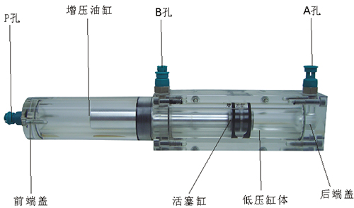 2、增壓油缸的前端、后端蓋、低壓缸體、增壓缸體等均采用了進口透明有機玻璃材料精制而成,透明清晰,活塞桿采用了合金鋁材料,并配合油接頭,密封圈,內六角螺絲等標準件裝配而成,通過它可明確地觀察到活塞桿,油封,油孔等結構及其運行過程,具有形象逼真,性能可靠等優(yōu)點,它既可作為教學模型,也可以液壓實驗元件進行實驗演示。