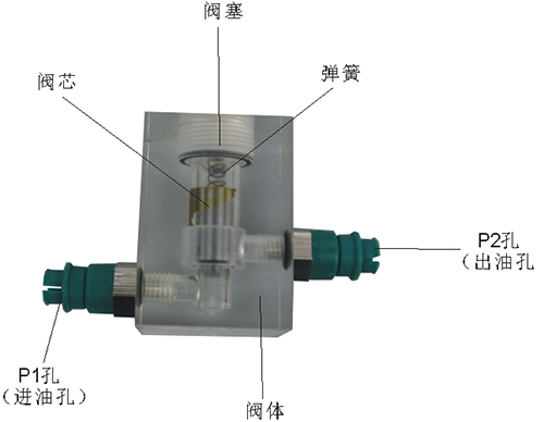 2、液控單向閥結構上參考了國產IY-25B型液壓單向閥,其閥體、螺塞等采用了進口透明有機玻璃材料精制而成,閥芯、頂桿采用了45#中碳鋼材料,并配合彈簧,油接頭,密封圈等標準件裝配而成,通過它可明確地觀察到活塞、彈簧、油孔等結構及其運行過程,具有形象逼真,性能可靠等優(yōu)點。它即可作為教學模型,也可以作為液壓實驗元件進行實驗演示。
