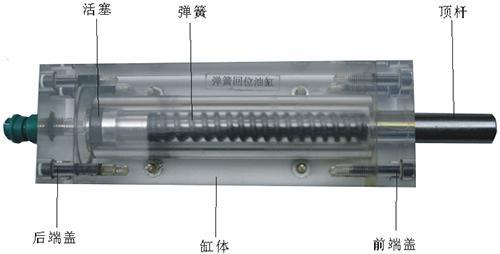 2、彈簧回位油缸的缸體,端蓋等均采用了進口透明有機玻璃材料精制而成,透明清晰,頂桿采用45#中碳鋼材料,并配合油接頭、密封圈、內六角螺絲等標準件裝配而成,通過它可明確地觀察到活塞、頂桿、油封、油孔、彈簧等結構及其運行過程,具有形象逼真,性能可靠等腰三角優(yōu)點,它即可作為教學模型,也可作為液壓實驗元件進行實驗演示。