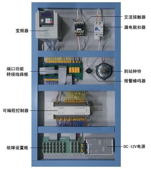 電梯的電氣控制系統(tǒng)采用PLC和交流變頻調(diào)速控制,其硬件結(jié)構(gòu)的組成及功能與實際電梯完全一樣。具有自動平層、自動關(guān)門、順向響應(yīng)轎內(nèi)外呼梯信號、直駛、電梯安全運行保護以及電梯急停、慢上、慢下、照明、風(fēng)扇等功能,性能可靠、運行平穩(wěn)、操作簡單、能耗低,特別適合于教學(xué)。此外,透明仿真教學(xué)電梯的軟硬件均采用開放式結(jié)構(gòu),因此,院校也可以利用此套裝置進行二次開發(fā)研究。